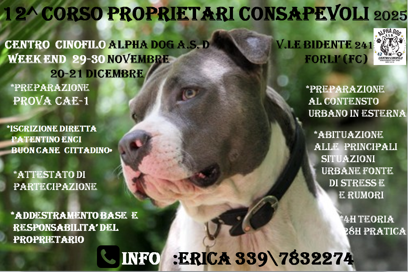 Un Corso Completo per Proprietari Consapevoli e preparazione al CAE-1 (Patentino Enci Buon Cane Cittadino) giunto alla sua 11^ Edizione per Diffondere una Positiva Cultura Cinofila e corretta Informazione sul Mondo Cane, 32 ore di FULL IMMERSION su 2 WEEK END 29-30 NOVEMBRE 20-21 DICEMBRE.